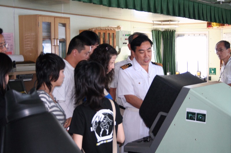 午前10時、船内放送で「ゆうとぴあ」のブリッジを見学出来るとの案内があり、まずは船内中央の案内所に集まる。