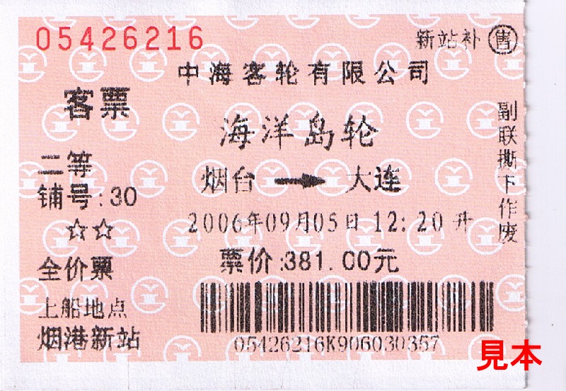![]() 煙台→大連の乗船券 2等個室なので381元 高っ! |