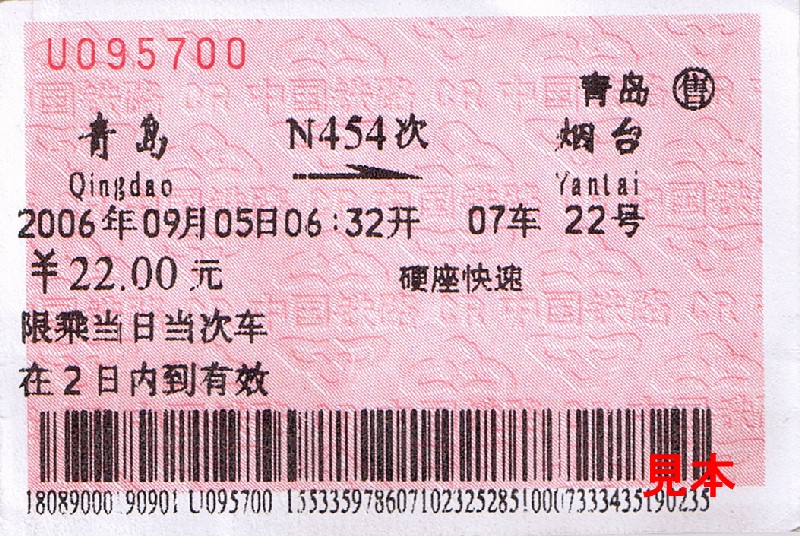 ![]() 青島→煙台の乗車券 硬座なのでたったの22元 日本円で300円程度 |